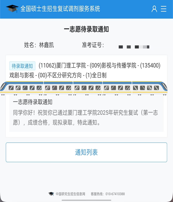 拿到拟录取资格的林鑫凯,不禁感慨道:“这几年自我学习与成长的经历,是我追梦路上最宝贵的财富。衷心感谢母校和老师们对我的培养与关心!”希望更多怀揣梦想的同学,像林鑫凯一样,不忘初心、勇敢追梦,在人生路上绽放属于自己的光芒,努力成为新时代的好青年。(艺术设计学院〔湘瓷学院〕易查方)