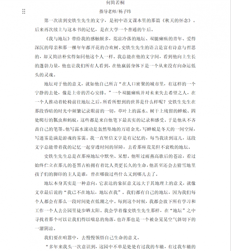 2023年7月20日,湖南省教育厅公布了2023年楚怡读书行动“悦读新时代 逐梦新征程”主题征文获奖名单,我校艺术设计学院(湘瓷学院)视觉传播设计与制作3212班的何简若桐同学,在杨子纬老师的指导下完成的作品《地坛与母亲》荣获省赛一等奖的佳绩。