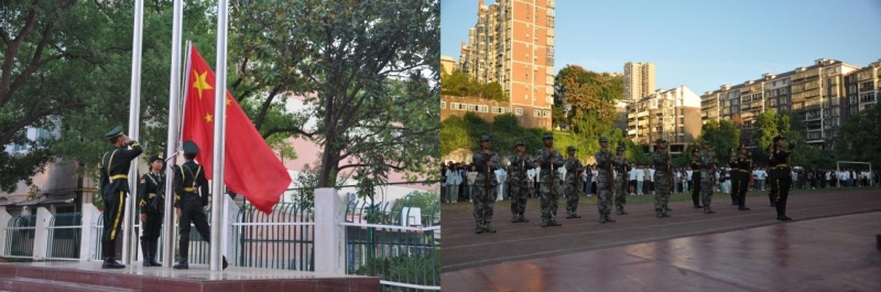 早上7点整,国旗护卫队学生昂首阔步,护送国旗至升旗台。伴随着国歌奏响,五星红旗冉冉升起,在熠熠晨光中迎风飘扬,全体师生面向国旗行注目礼,在庄严的氛围中感受激荡人心的爱国之情,凝聚团结奋斗的磅礴力量。