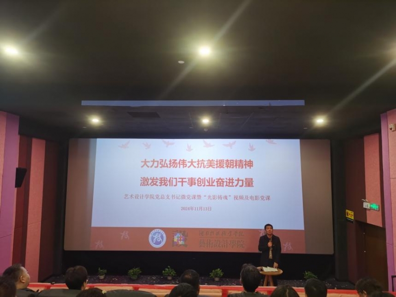 在电影院,党总支书记邓建辉,以《大力弘扬伟大抗美援朝精神,激发我们干事创业奋进力量》为题,讲授了一堂有关抗美援朝精神的微党课。他结合习近平总书记关于抗美援朝精神的重要论述,指出了抗美援朝精神的深刻内涵、重要意义和地位,强调全体党员要传承发扬伟大抗美援朝精神,汇聚万众一心、勠力同心的民族力量,激发守正创新、奋勇向前的民族智慧,凝聚共识、团结奋进,积极营造干事创业、改革创新的全新氛围,做奋斗者,做奋斗的支持者,为推进艺术设计学院各项事业更好发展再立新功。