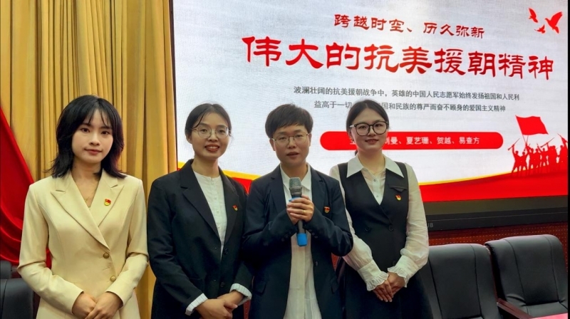 2024年10月21日,为纪念中国人民志愿军抗美援朝出国作战74周年,学院学生党支部组织委员夏艺珊进行了国旗下的讲话。她讲述了抗美援朝的革命战争故事,呼吁各位同学积极弘扬伟大抗美援朝精神,雄赳赳、气昂昂,向着全面建设社会主义现代化国家新征程,向着实现中华民族伟大复兴的中国梦继续奋勇前进。