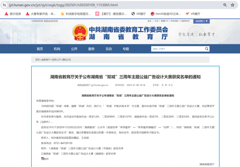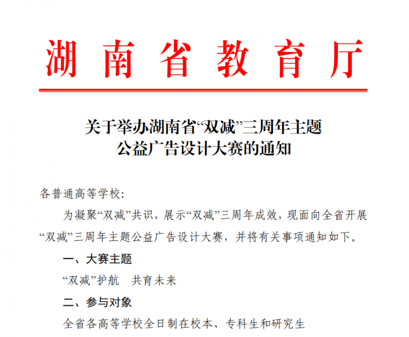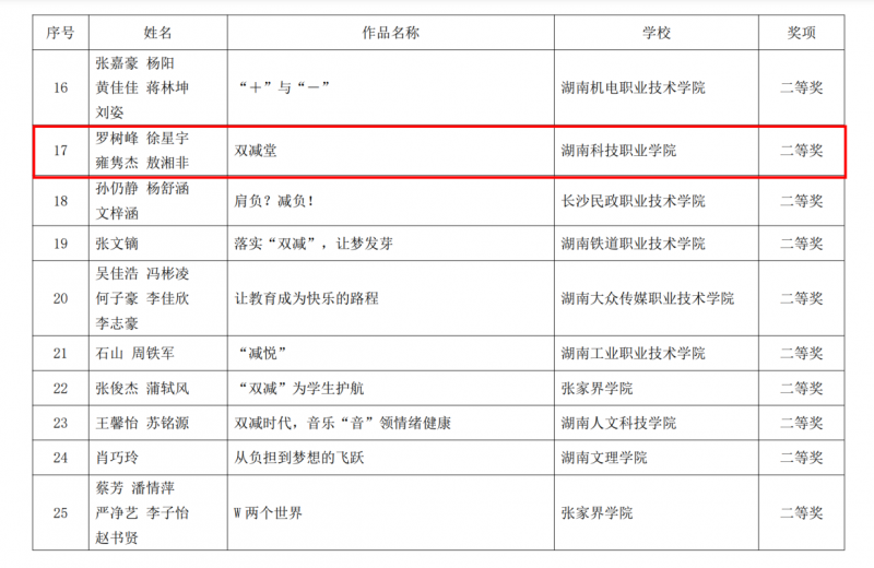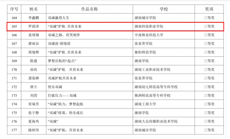 本次赛事以“‘双减’护航 共育未来”为主题,旨在持续巩固我省义务教育“双减”成果,凝聚“双减”共识,面向全省各高等学校全日制在校本、专科生和研究生开展,共有平面及视频类863件作品参赛。为取得比赛的优异成绩,艺术设计学院(湘瓷学院)指导老师和团队提前做好了充分准备,精心打磨、追求品质、突出创意,最终在此次大赛中脱颖而出、喜获荣誉。这不仅是对我院师生专业能力和水平的认可,更是对他们工匠精神、创新精神和社会责任感的肯定,体现了学校对高素质技能人才培养的重视,显示了学校高质量发展的成效。