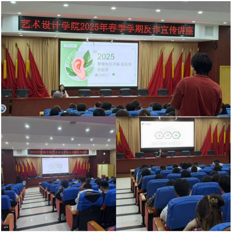 为提高广大学生反诈意识和能力,预防电信诈骗事件发生,4月8-10日,艺术设计学院(湘瓷学院)党总支副书记刘曼组织部分辅导员,在雨花校区多功能报告厅面向全体学生开展了题为“警惕电信诈骗,远离帮信犯罪”的2025春季学期反诈宣传系列讲座。