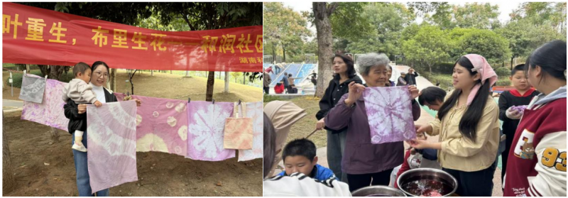 随后,活动的重头戏——天然染色在沙滩公园广场上火热开启。志愿者们架起锅具,将处理后的落叶蒸煮,提炼出粉紫、棕褐等色的天然染液。居民在我校师生指导下,学习使用明矾等环保媒染剂对白布进行预处理,并通过浸染、捆扎等工艺,将素白布品浸入自然色彩之中。当一幅幅纹样独特、散发草木清香的染布在阳光下展开时,现场赞叹与欢笑不绝于耳。