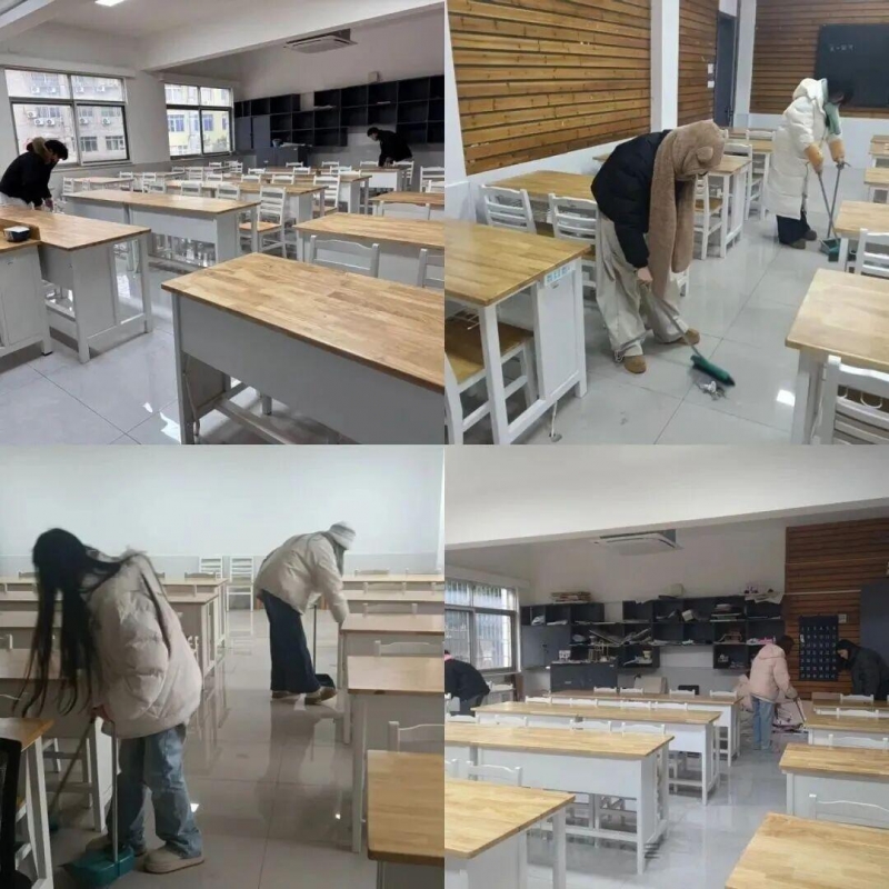 心得交流环节结束后,清扫实践活动随即展开。舒厚源书记与何香老师率先垂范,带领同学们明确分工、有序行动。大家手持扫帚、抹布、水桶等清洁工具,对教室、走廊、自习室等公共区域展开全方位清扫。从地面散落的纸屑杂物,到门窗桌椅的积灰印记,再到卫生死角的顽固污渍,每一处都被认真清理。同学们不怕脏、不怕累,相互配合、干劲十足,经过一番努力,学习备考区域焕然一新,窗明几净的环境让人眼前一亮。